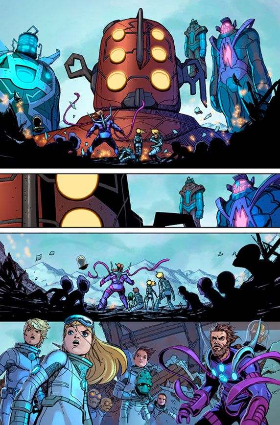 Na última edição de Fundação Futuro, Dr. Destino e um dos Reeds alternativos haviam se prontificado a se sacrificarem em uma batalha contra 3 Celestiais, com a intenção de salvar as crianças, Nathaniel e Kristoff. Mas, não poderia ser tão simples, né? O portal que ligava a realidade 616 ao Conselho foi preso em seu formato aberto pela mão de um dos Celestiais, tornando assim o sacrifício dos dois algo inválido.