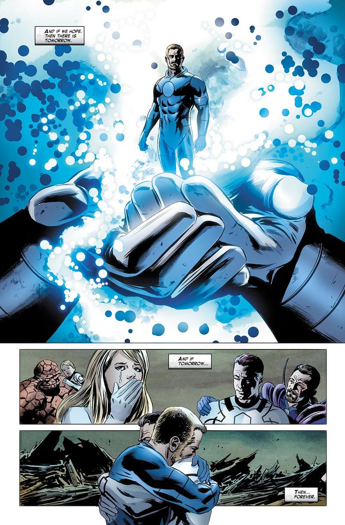 O envelhecido casal de filhos de Reed e Sue, os mesmos que já haviam aparecido tempos atrás elaborando seus planos com Nathaniel, lá no futuro. Sem tempo para apresentações, o velho Franklin se revela o "amigo imaginário" de sua contraparte do presente. Lembram daquele embrião de universo que o jovem mutante da família criou assim que recuperou os poderes? Pois bem, aquilo era uma energia que foi guardada dentro do garoto e que finalmente seria usada, para derrotar os deuses espaciais. Mas nem isso foi suficiente, uma grande batalha, com direito a Galactus, o primeiro arauto de Franklin, foi travada. Motivado com a possibilidade de não perder seu pai, de poder crescer com o carinho paterno, o menino mais jovem da família Richards (em sua versão já adulta) consegue surpreendentemente vencer o mau e sair vivo para contar a história.