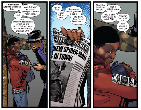 Brian Michael Bendis vem fazendo o impossível. Não está deixando os leitores com saudade de Peter Parker. As histórias de Miles são envolventes e igualmente bem escritas. A origem e primeiros dias do personagem foram muito bem retratados, assim como seus próprios antagonistas e coadjuvantes. Se para Parker seu tio foi um exemplo a se seguir, para Morales o seu é um exemplo negativo. Uma bela referência e sacada do escritor.