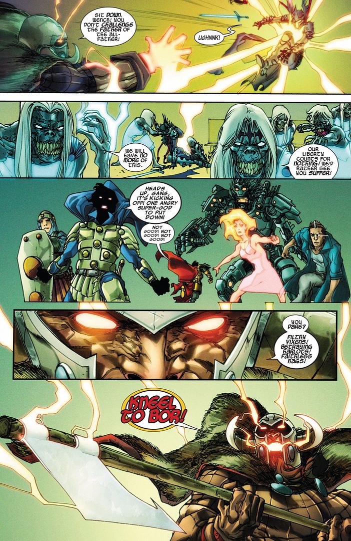 O casamento é celebrado em uma igreja, tendo a participação dos asgardianos desmemoriados, Hela, os Novos Mutantes e Loki. Inconformada com a desolação das Disir, obrigadas a se casar contra a vontade para quebrar a maldição, Dani Moonstar se indigna ao máximo com os juramentos absolutamente machistas que Bor exigia para celebrar a união e parte para o ataque, iniciando um enfrentamento generalizado entre deuses e mutantes. No meio da briga, Bor é ferido, o que atiça o instinto perseguidor das Disir, que partem para o ataque inclemente contra o pai do pai de todos.