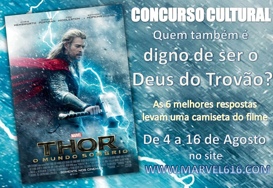 O filme só estreia em Novembro, mas você já vai estar concorrendo a prêmios a partir de agora. Para tal, basta responder a pergunta de nosso concurso cultural. . "Quem também é digno de ser o Deus do Trovão?".E porque?". Nesse concurso você pode escolher qualquer personagem fictício ou real, contanto que seja coerente e use o bom senso. Clique AQUI ou na imagem deste post para ter acesso ao nosso formulário. Responda corretamente os dados cadastrados e elabore uma resposta criativa e original com no máximo 200 palavras!