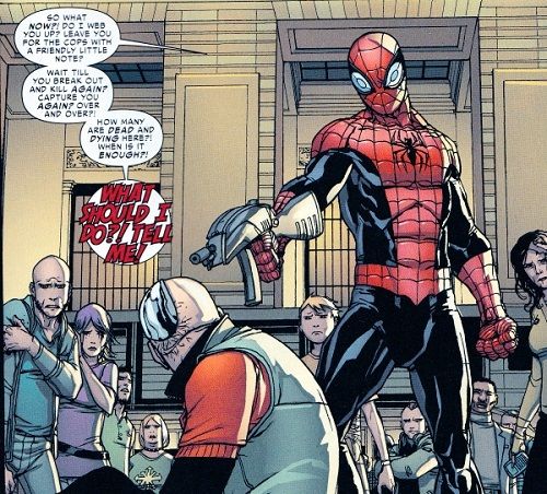 Mas o Aranha Superior não se comove e termina a história ali mesmo na frente da população novaiorquina. Pra completar, ainda faz a empresária citada acima a se entregar às autoridades por ter negociado com o Massacre.