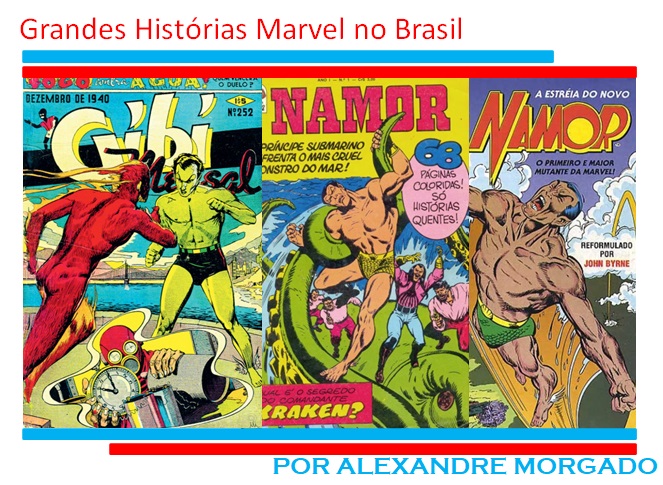 Namor, o protagonista dessa matéria, foi quem abriu as portas para a Timely no Brasil. A primeira aparição dos personagens por aqui, aconteceu na edição nº 142, de abril de 1940, com as histórias publicadas originalmente em Marvel Mystery Comics nº2, com o personagem Namor, o Príncipe Submarino, criado pelo artista Bill Everett, inspirado em aventuras marítimas e baseando-se nas histórias de Atlântida, o reino perdido. Após uma missão no Continente Antártico, Leonard McKenzie, um capitão da Marinha americana, provoca uma destruição com explosivos, causando danos à civilização de Atlântida. O imperador atlante chamado Thakorr envia a sua filha, a princesa Fen, para investigar o caso. Chegando à superfície, a princesa Fen se envolve com o capitão Mckenzie e após retornar para Atlântida, descobre que está grávida. Tempos depois nasce Namor - filho de uma atlante com um humano. Essa história da origem do personagem é a que foi publicada na edição de Marvel Comics n° 01 pela Timely, em 1939. No Brasil, essa história foi publicada na edição de Gibi nº210, em setembro de 1940. Namor é considerado o primeiro mutante da história da Marvel. Na primeira década de publicações, Namor era o maior personagem da editora no Brasil.